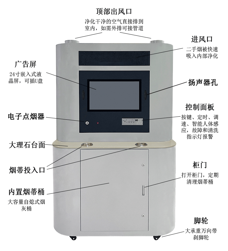 申瑞吸煙室空氣凈化機,內置高壓靜電場(電子集塵室)+層流過濾網+活性炭吸附+負氧離子功能,高效凈化清新室內空氣。