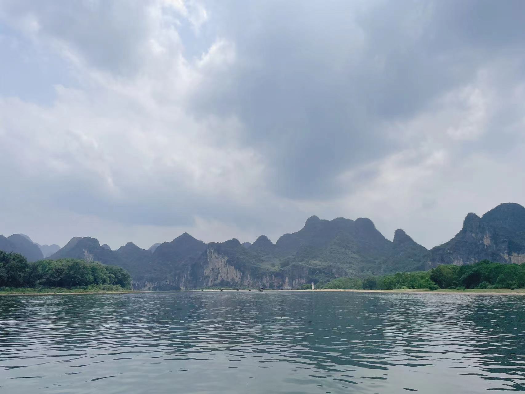 下午我們乘坐小竹筏,游覽漓江。兩岸山峰清秀迤邐,連綿起伏,形態(tài)萬(wàn)千,江岸綠草如茵,翠竹蔥郁,樹木繁蔭。讓人仿佛進(jìn)入了天人合一的詩(shī)意境界,返璞歸真的自由天地。